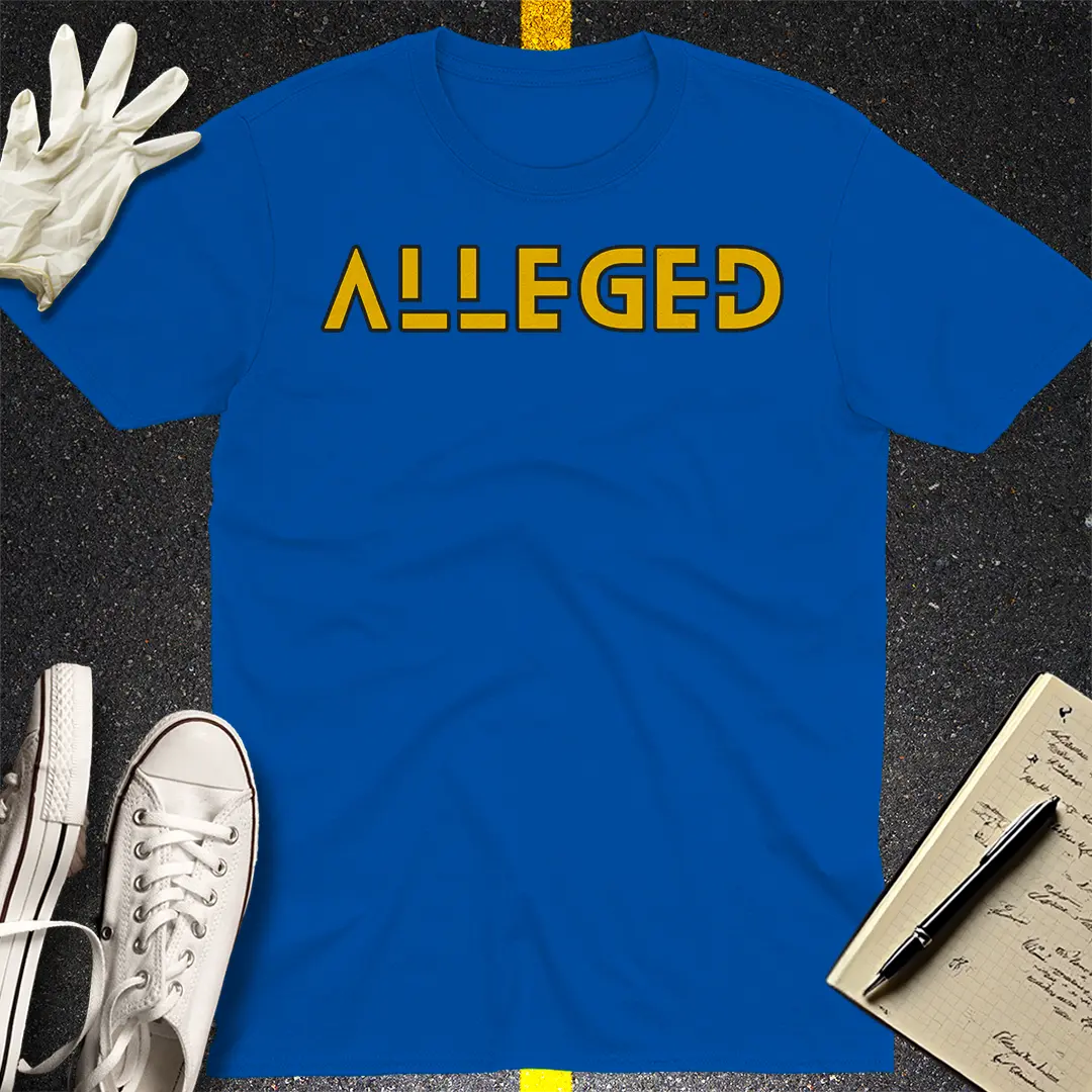 Our branding - Alleged Tee - is a minimalist and bold design in a sleek, modern typeface. Perfect for true crime fans, legal professionals, or anyone who enjoys a touch of mystery. Wear it with confidence, and let the world speculate!