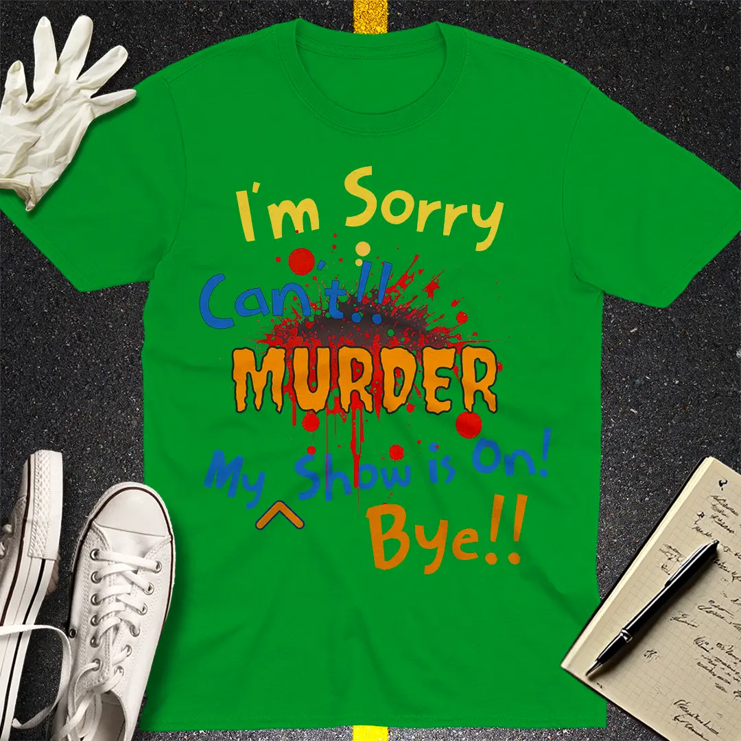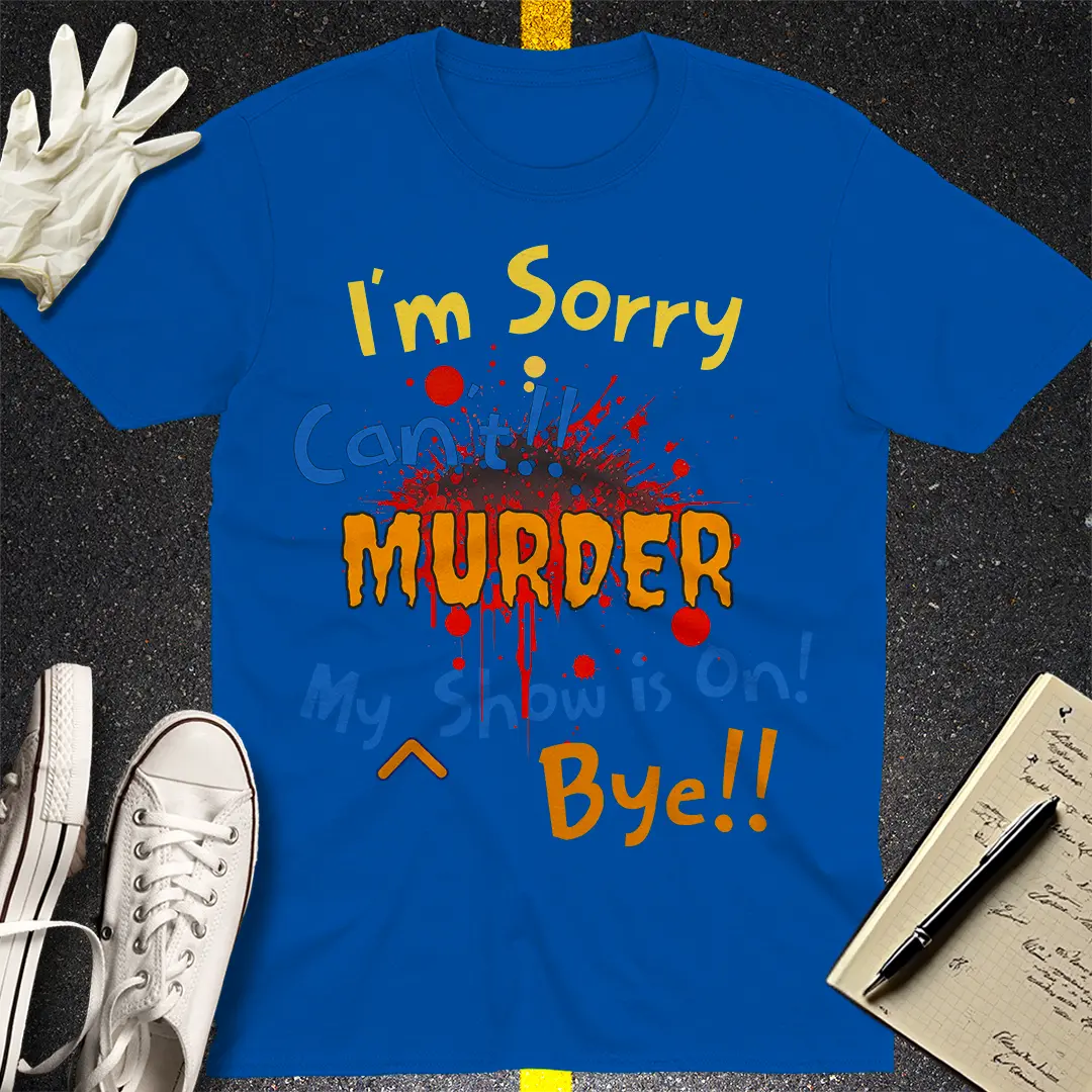 This eye-catching design features a playful yet edgy message, "I'm Sorry, Can't!! Murder Show is On! Bye!!" with bold typography and blood splatter effects. It is a must-have for true crime lovers who prioritize their favorite murder mysteries over socializing.
