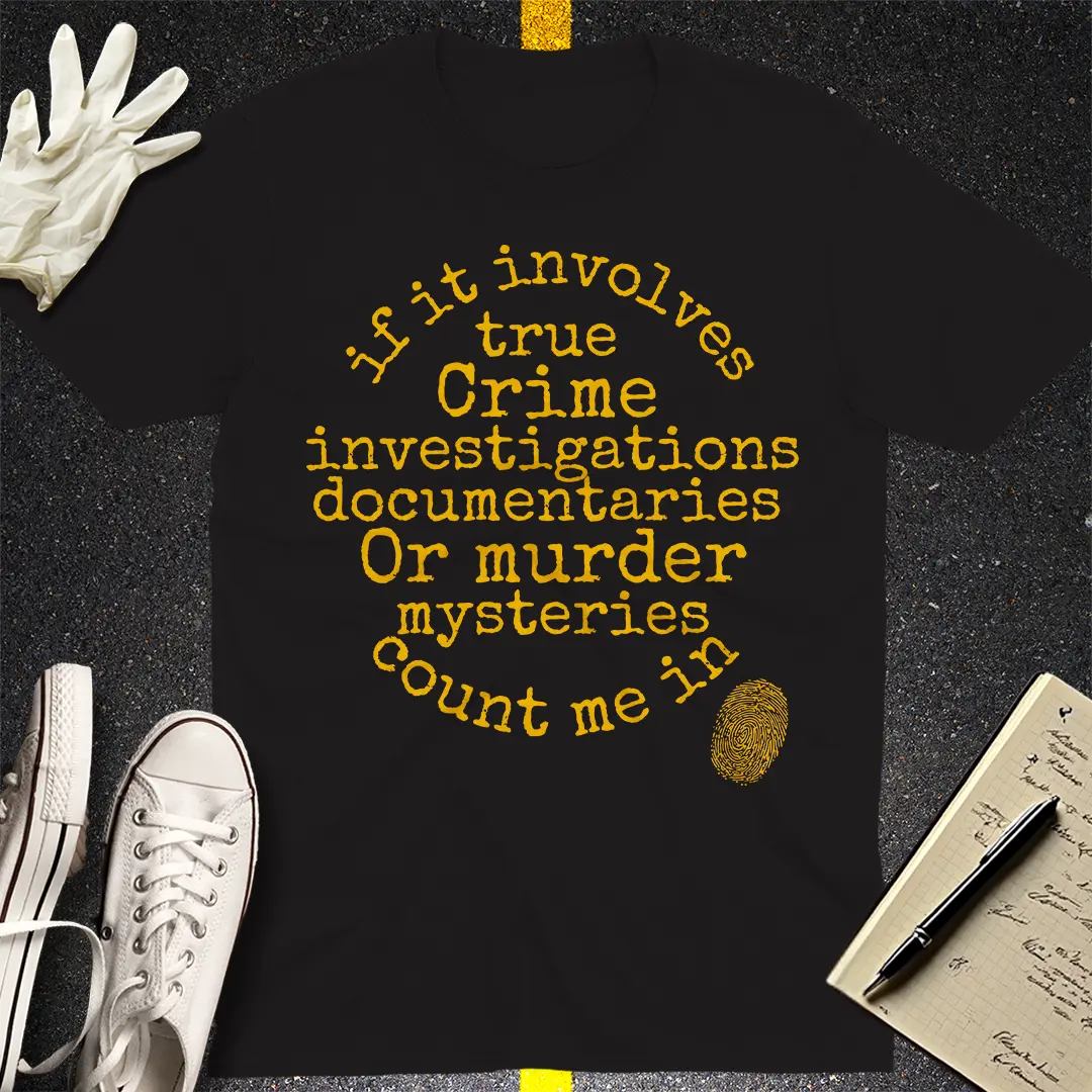 Essential for true crime fans, this eye-catching red and black design features a vintage typewriter-style font that emphasizes everything a crime enthusiast adores—investigations, documentaries, and murder mysteries. With a fingerprint detail, it's the perfect statement piece for those who can't resist a good whodunit.
